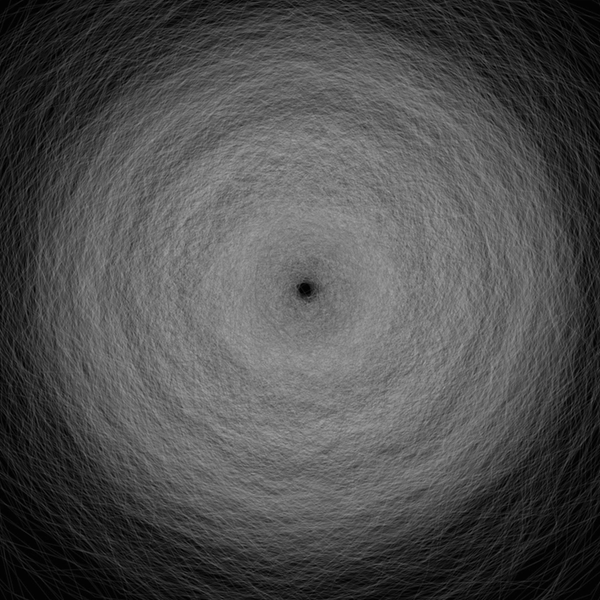 In this sketch polygons of different sizes are created by consuming the fractional part of famous real numbers. As a shape's size increases gradients are created from the overlapping shapes.